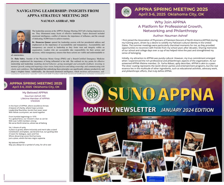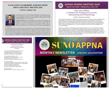 "Suno APPNA" newsletter began with an in-depth focus on the APPNA Strategy Meeting, highlighting actionable items from the SWOT analysis on various fronts. Subsequent issues covered topics such as APPNA's educational landscape and achievements of educational committees like MERIT, YPC, and RESA, and celebrated the accomplishments of different chapters. Recaps of the Spring and Summer Meetings offered summaries of CME sessions, educational seminars, and networking events. In addition, issues focused on membership data, philanthropic projects, advocacy efforts, and the Fall Meeting highlights. Collectively, these editions have kept members informed and engaged with the diverse activities and goals of APPNA.